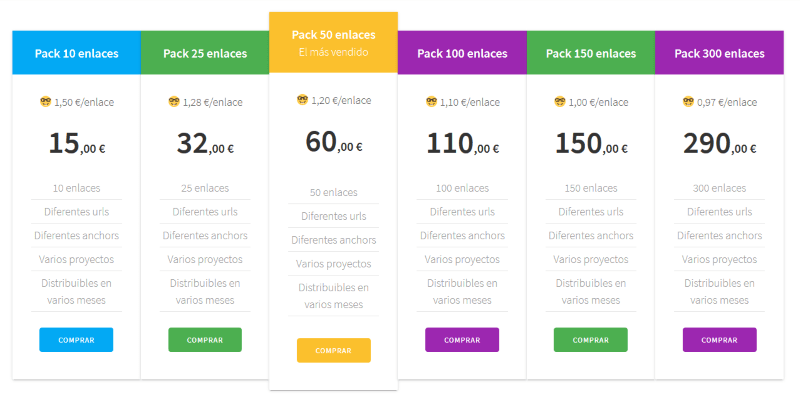 - Pack 50: 50 backlinks por 60 € (1,20 € el enlace).